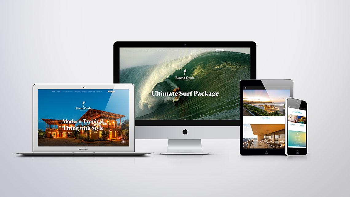 Website do Buena Onda Beach Resort, localizado em Playa Santana, na Nicarágua.